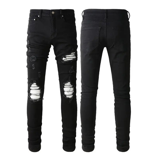Men's White Patch Distressed Black Denim Jeans